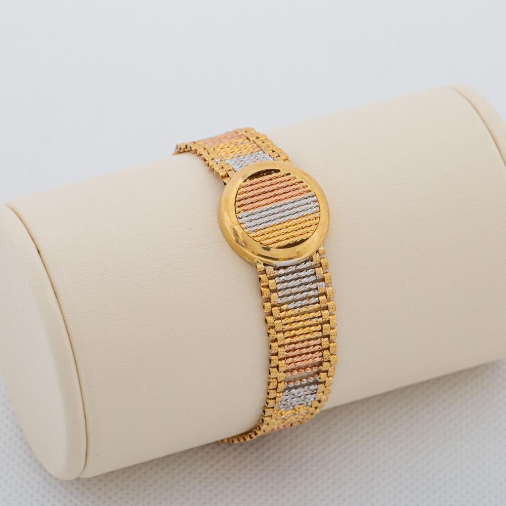 هي اسوارة ذهب فاخرة مصنوعة بتصميم لازوردي بشكل يشبه ساعة اليد، تتميز باحتوائها على عدة ألوان "ذهبي، أبيض، روز" ومصاغة بلمسة فنية راقية وبدقة عالية.