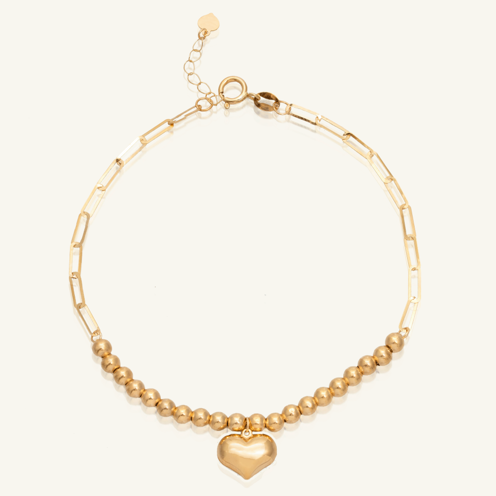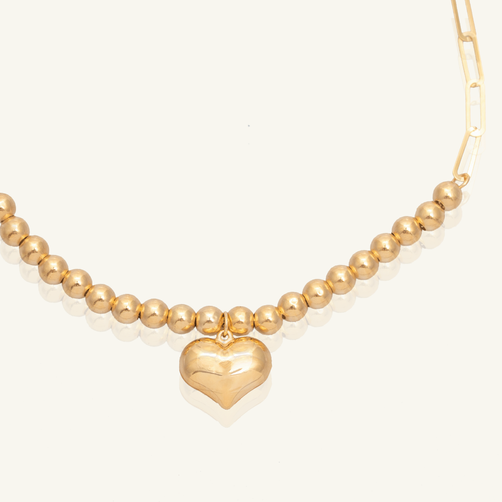 هو انسيال ذهب عيار 18 قيراط مصنوع بموديل ميكس يجمع بين تصميم الجنزير الناعم وتصميم كرات ذهبية متصلة ببعضها، يزينها تعليقة بشكل قلب تضفي عليها لمسة من الحيوية.