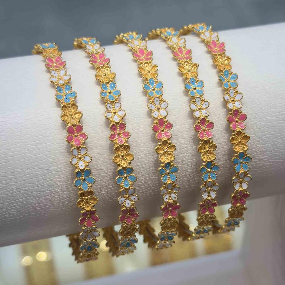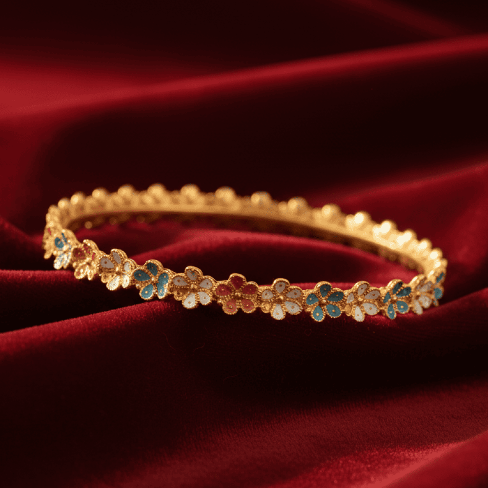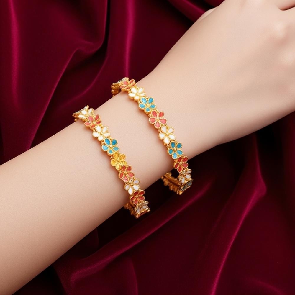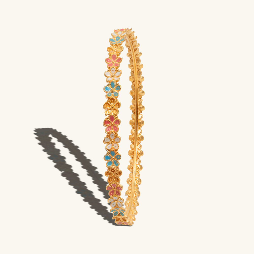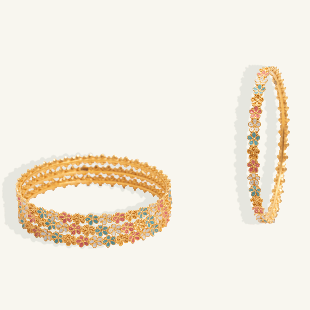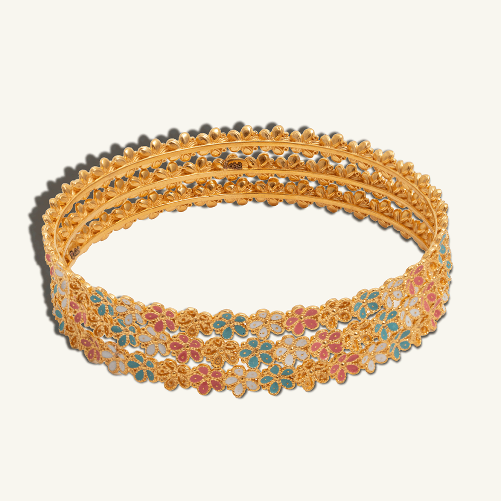 يتميز هذا الموديل بتصميم رفيع جداً يحيط بالمعصم بسلسلة من الوردات المتقنة. كل وردة مطعمة بعناية بألوان المينا الزاهية (وردي وتركواز وأبيض)، مما يخلق تبايناً بصرياً ساحراً مع بريق الذهب الأصفر عيار 21. هذا التصميم يمثل الأناقة في أبسط صورها، مما يجعلها مناسبة لكل الأوقات.