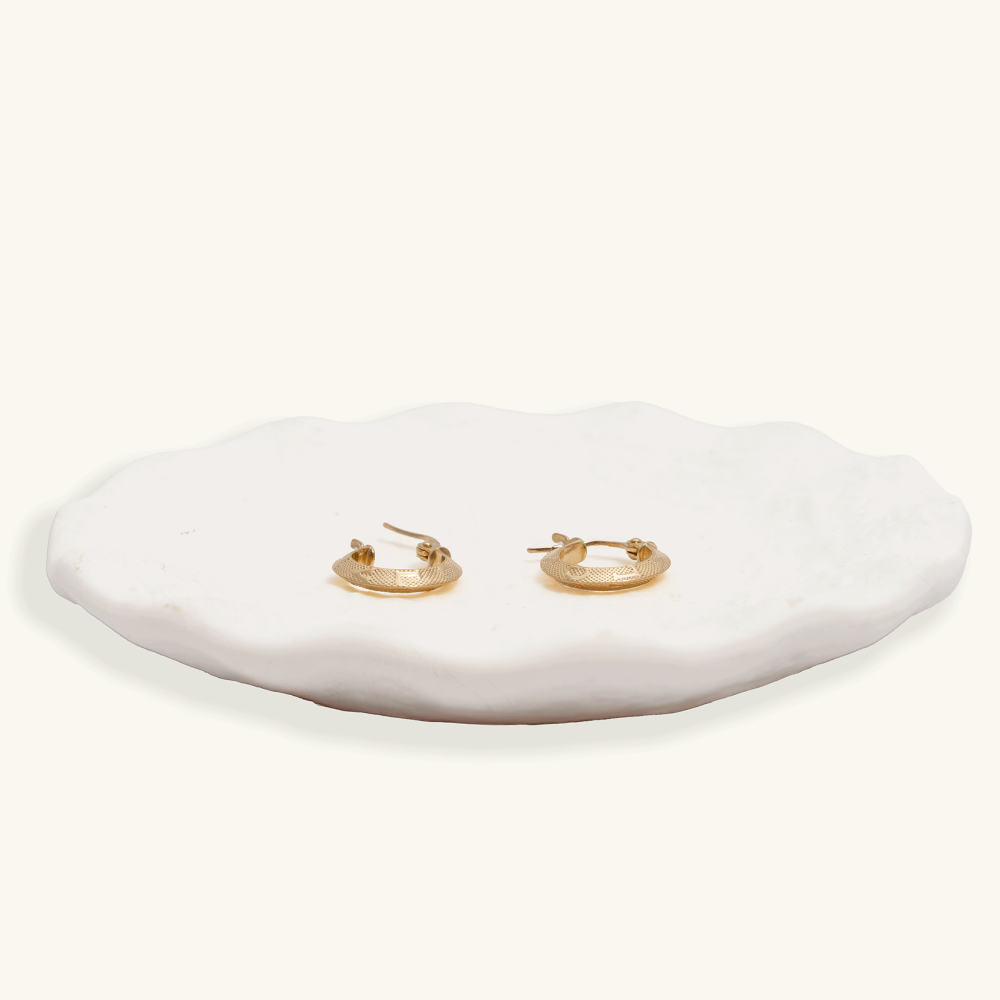 هو حلق ذهب دائري يجمع بين الفخامة والنعومة بتصميم رفيع، بسطح مميز بنقوش فاخرة مع رسم أحرف تضفي عليها لمسة من الأناقة.