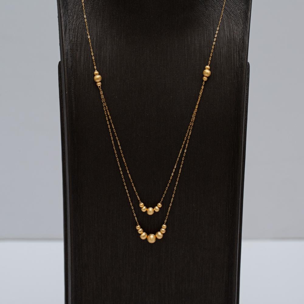 تمتعي بإطلالة يومية مميزة مع سلسال ذهب ناعم بتصميم دورين، مصنوع بلمسة إيطالية مميزة، يتكون من سلسلة ذهبية رفيعة وناعمة تتصل بسلسلتين مزينات بكرات ذهبية ذات تصميم جذاب.