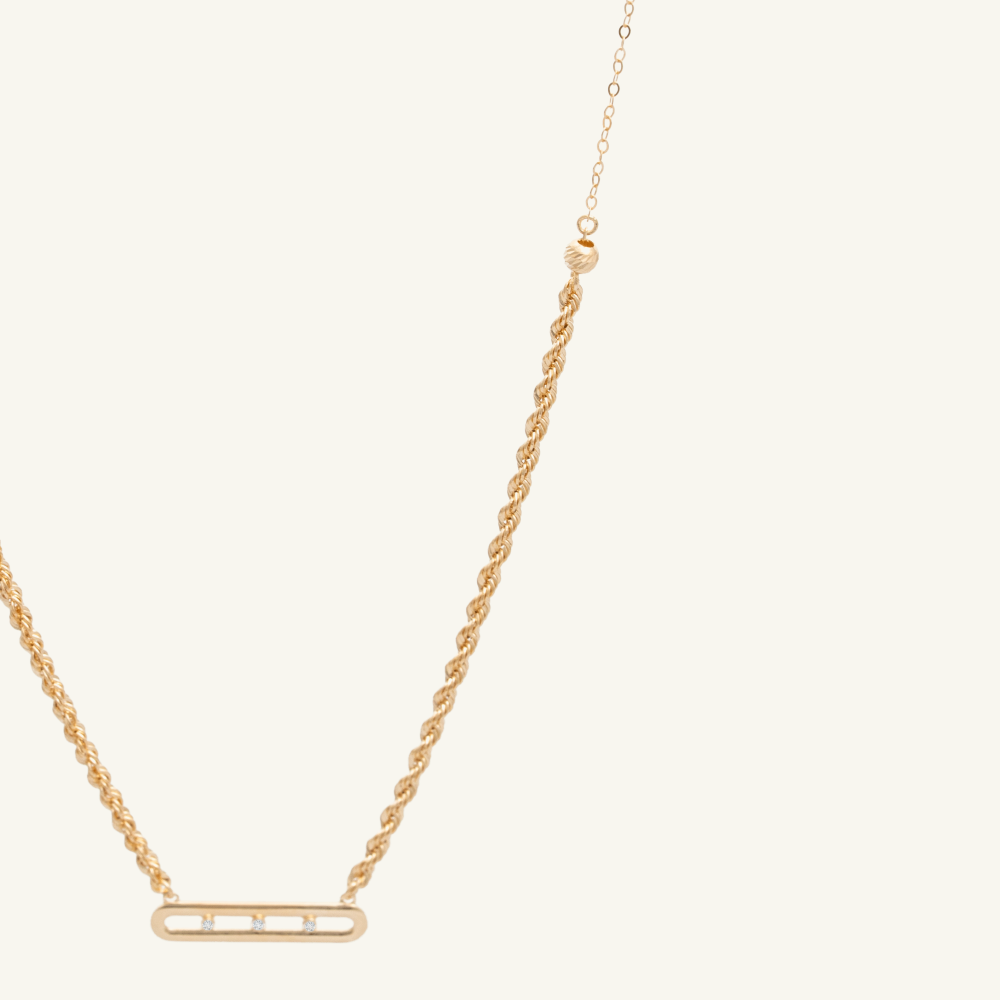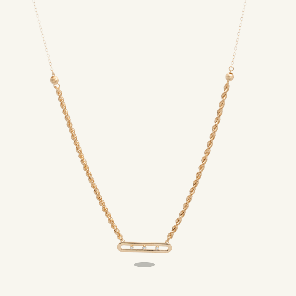 هو سلسال ذهب ناعم مصمم بموديل مبروم فاخر ومزين بتعليقة عرضية الشكل مرصعة بثلاثة أحجار من الزركون اللامع بتصميم ألماس.