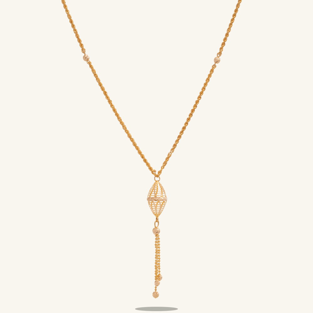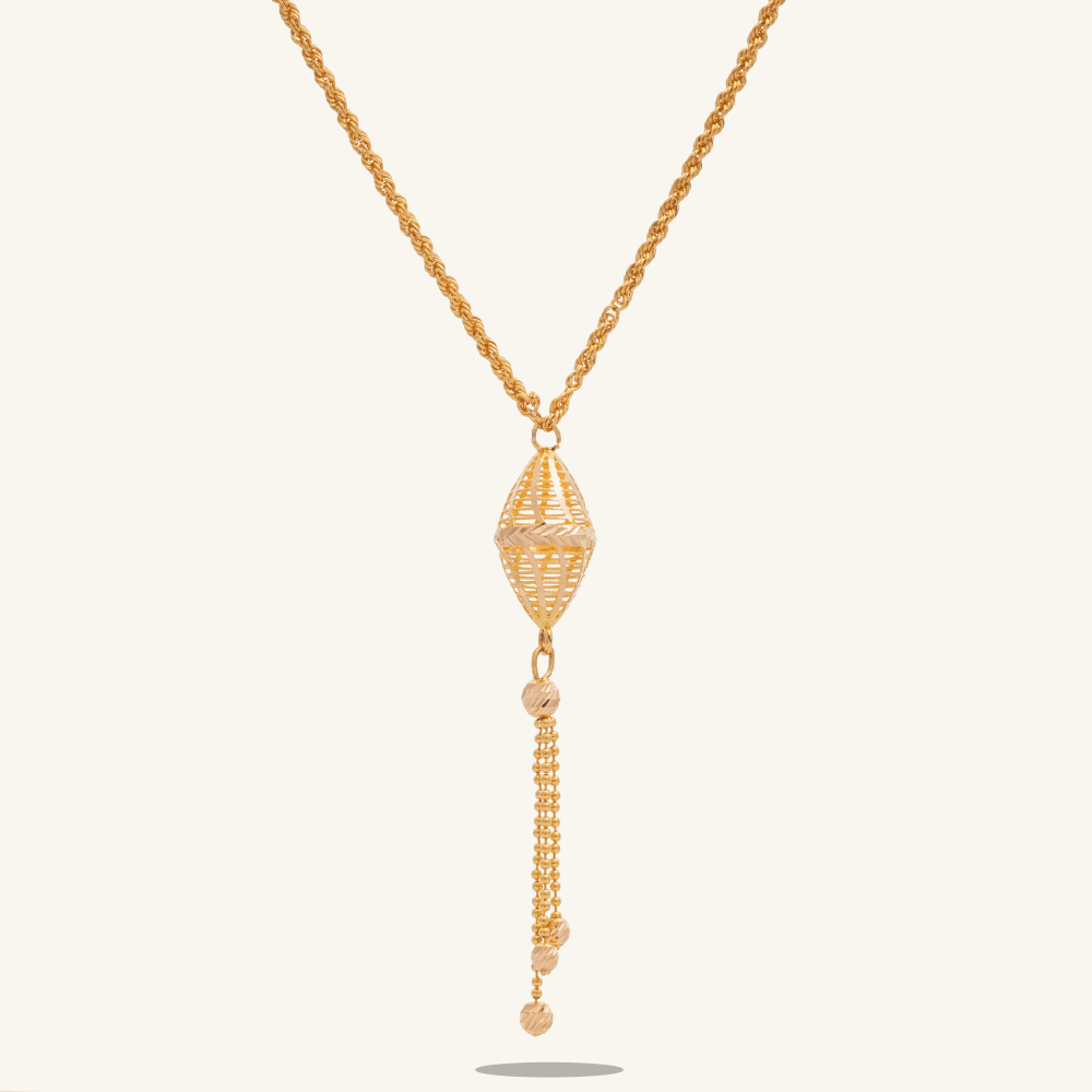 هو سلسال ذهب ناعم عيار 21 قيراط، مصنوع بموديل سبحة فاخر، مكون من سلسال بتصميم مبروم بشكل كامل، مزين بتعليقة مفرغة ذات تتمتع بتفاصيل فنية دقيقة تشبه شاهدة السبحة، وتتدلى منها ثلاث سلاسل بتصميم حبيبات متصلة ببعضها، لتضفي على القطعة مزيداً من الفخامة والأناقة.