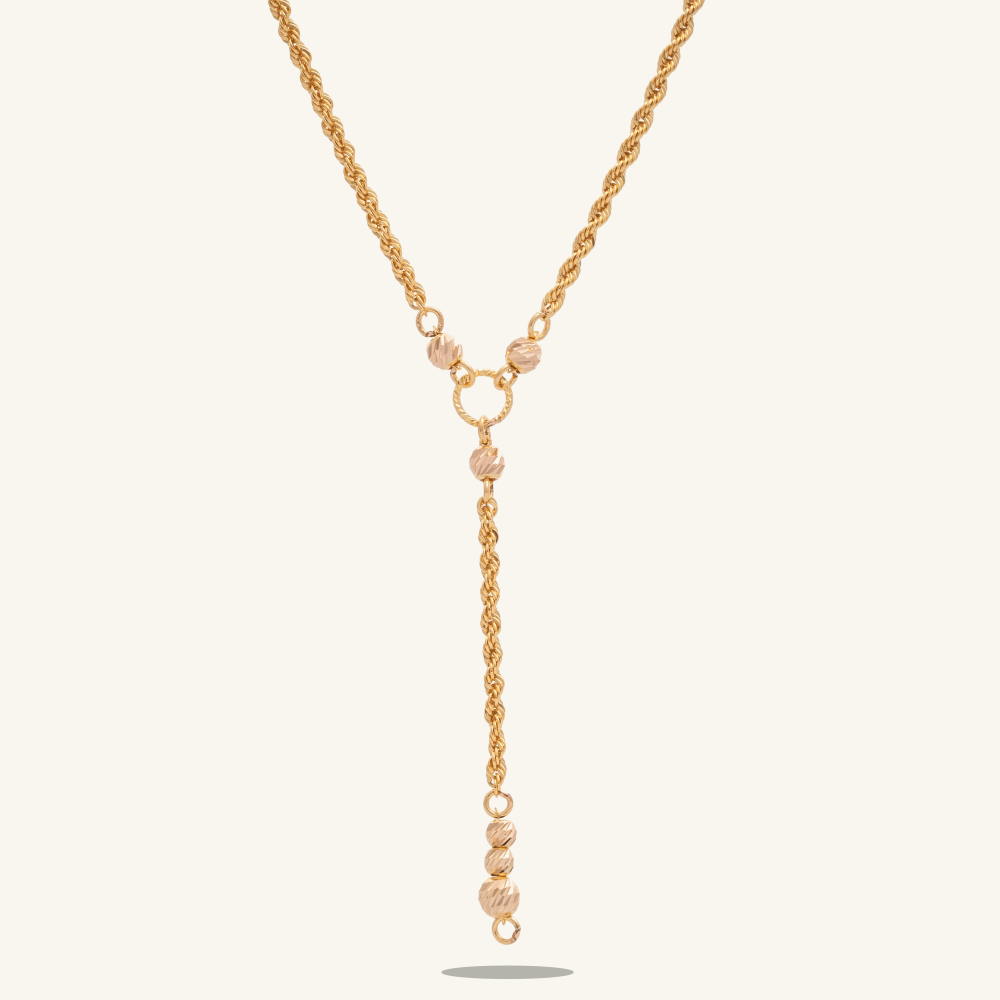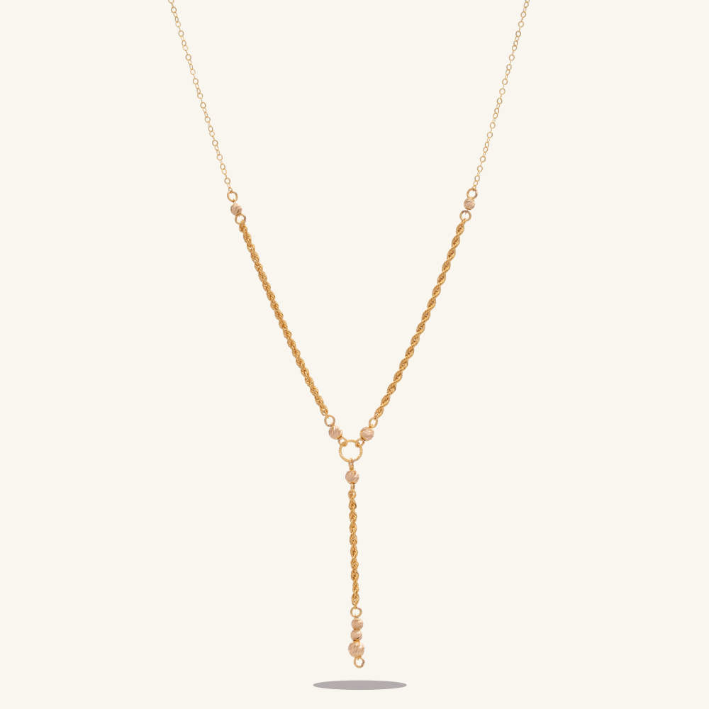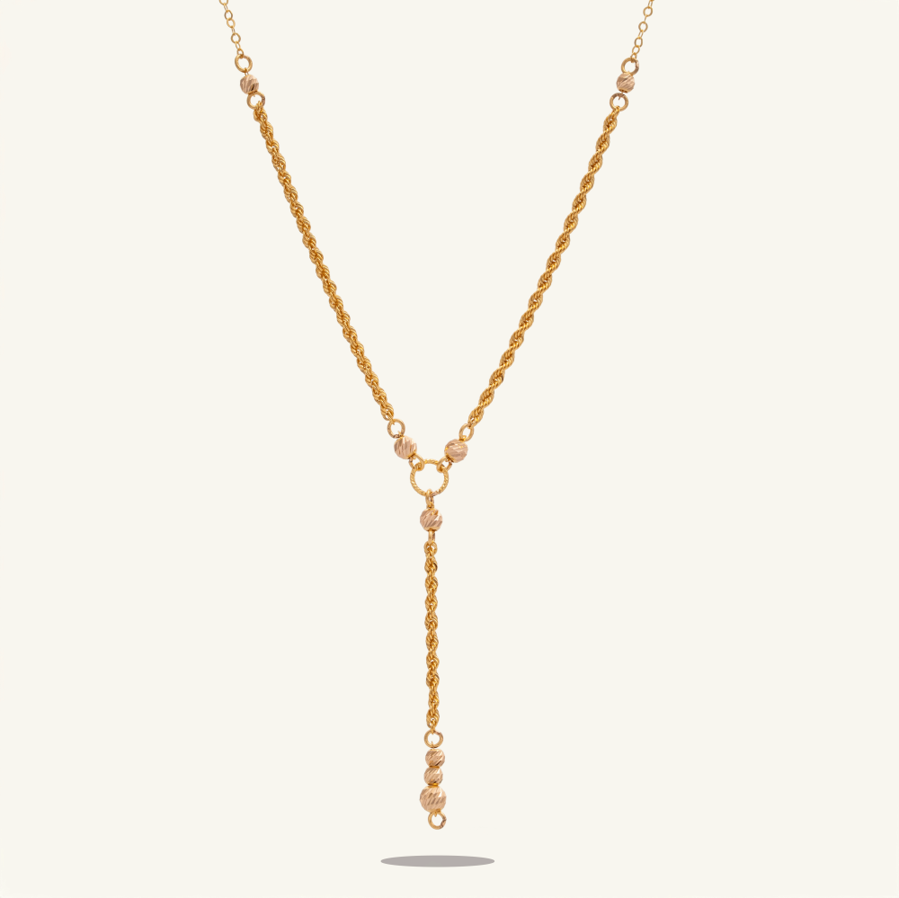 هي قطعة ذهبية فريدة تجمع بين النعومة والفخامة في سلسال ذهب عيار 21 قيراط، مصنوع بتصميم مبروم أنيق وفاخر تزينها كرات ذهبية ناعمة.