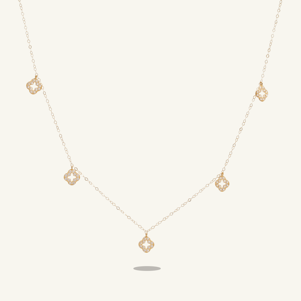 يتكون من سلسال ناعم تزينه 5 تعليقات بتصميم وردة البرسيم ومرصعات بأحجار الزركون اللامعة بتصميم ألماس، لتضيف ألقاً وجمالاً على الشوكر.
