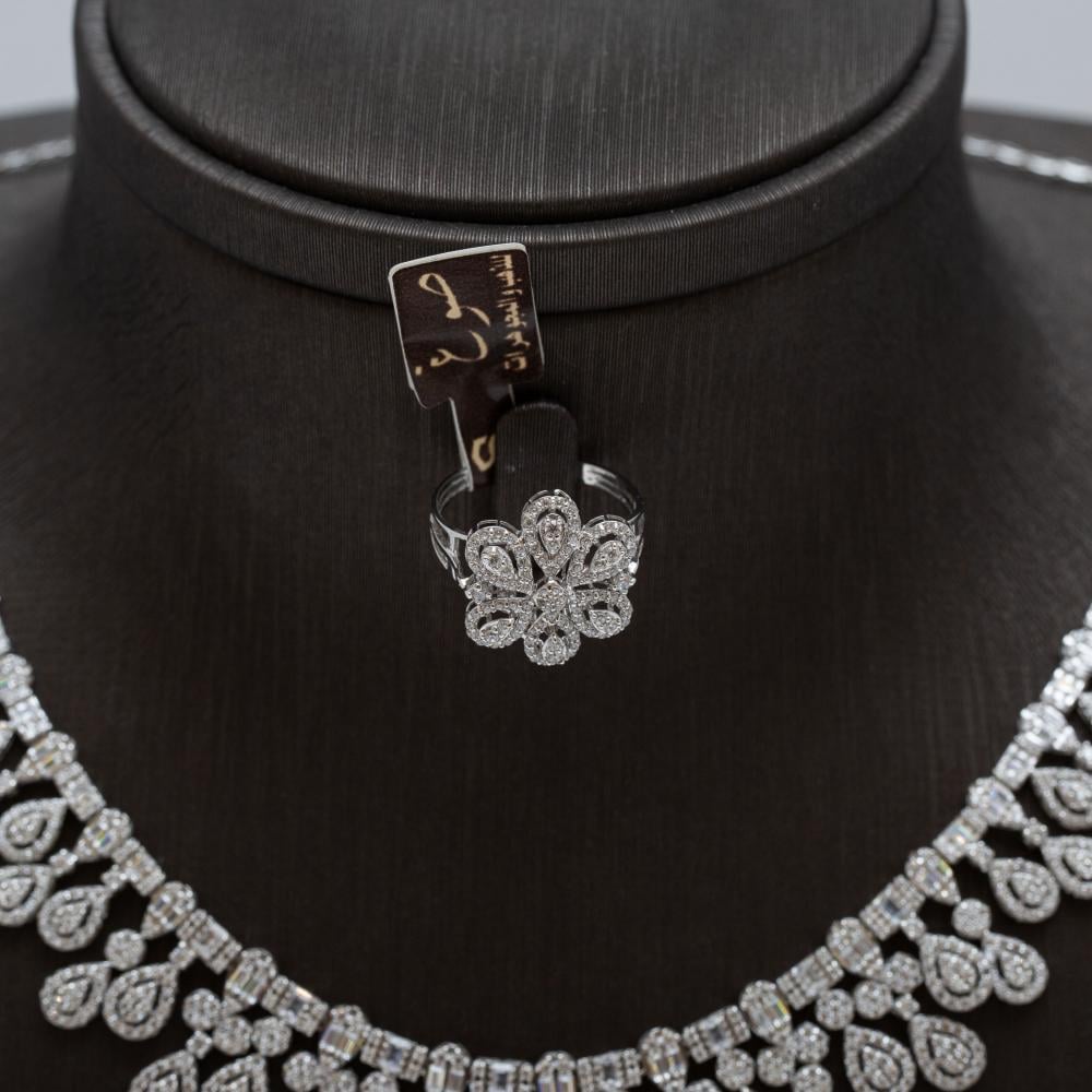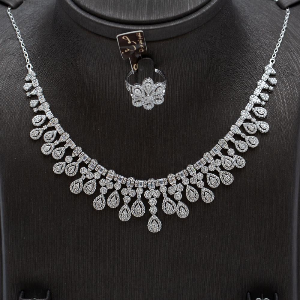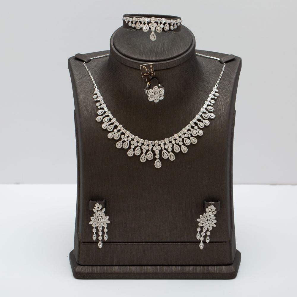 هو طقم ذهب أبيض يأتي بموديل شبكة، يتكون من (عقد وخاتم وزوج حلق واسوارة) مصنوع بتصميم أنيق مرصعاً بأحجار الزركون اللامعة بتصميم ألماس فاخر.