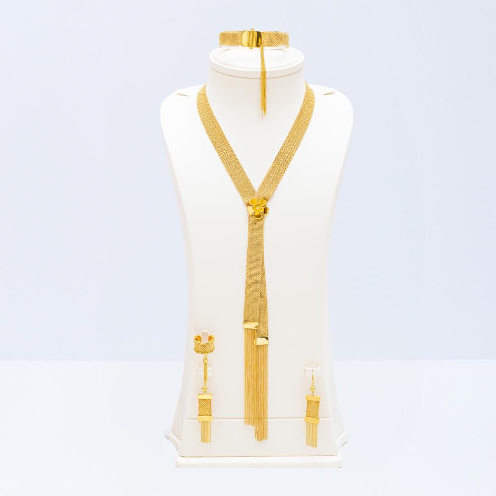 - يتكون من 5 قطع ذهبية مصنوعة بعيار 21 قيراط، بتصميم متناغم.