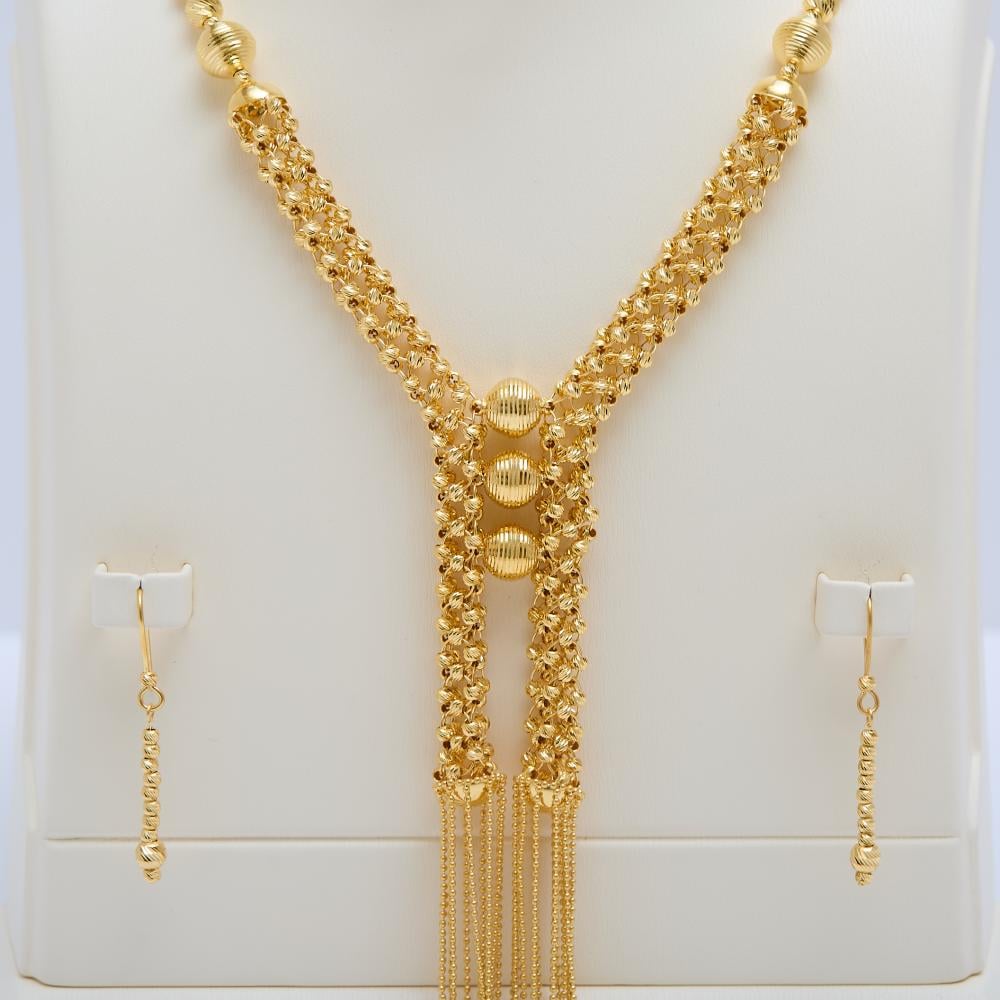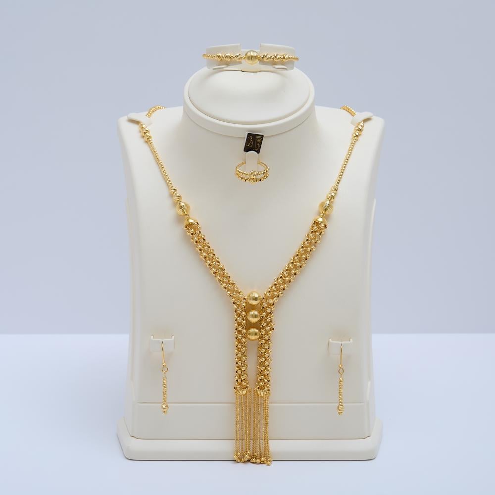 هو طقم ذهب فاخر، مصنوع من ذهب عيار 21 قيراط بتصميم إيطالي فخم بموديل دوريكا ذو الكرات الذهبية الصغيرة.