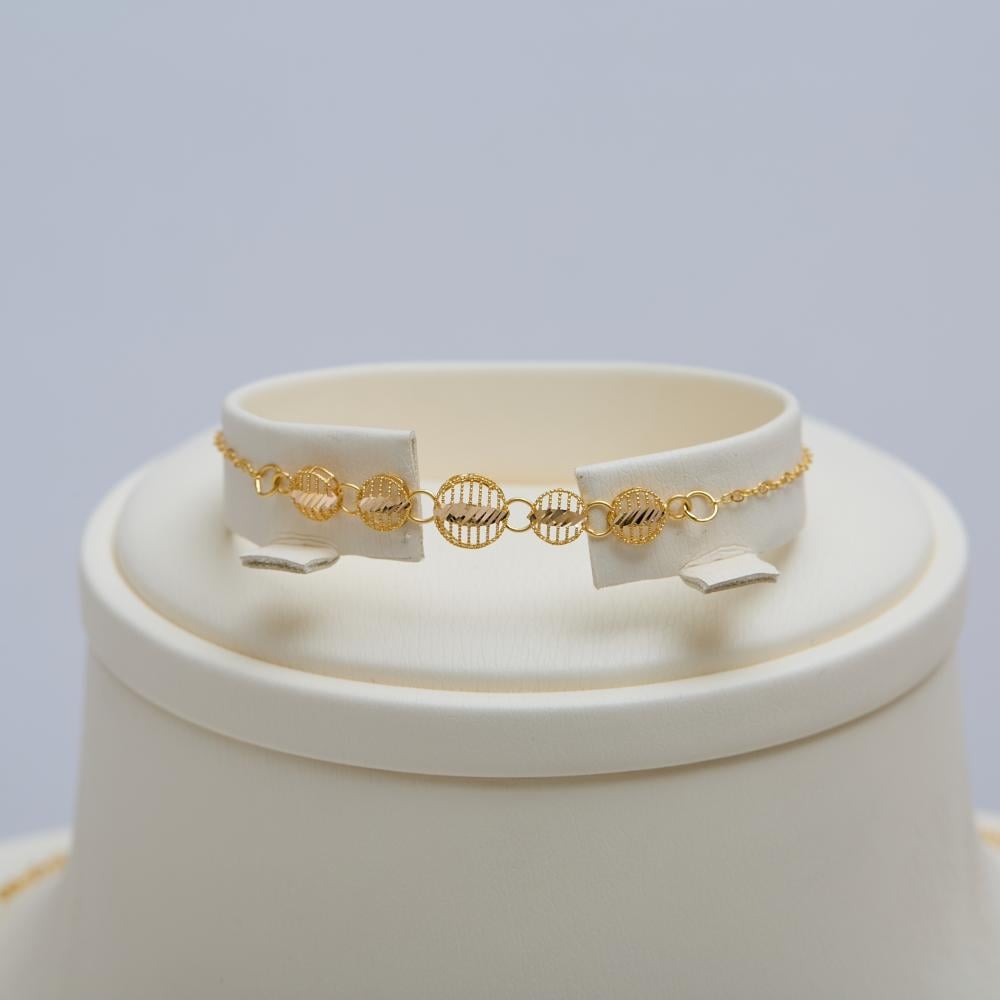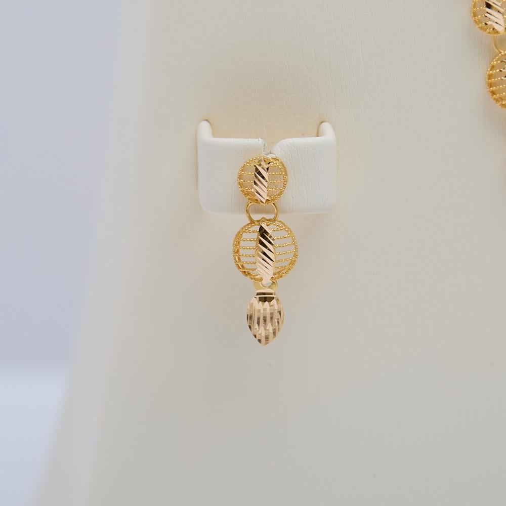 تصميم الطقم يعتمد على قطع دائرية الشكل تزينها حبيبات ذهبية صغيرة جداً ملتصقة ببعضها وتتوج برقاقة مموجة بتصميم أنيق.