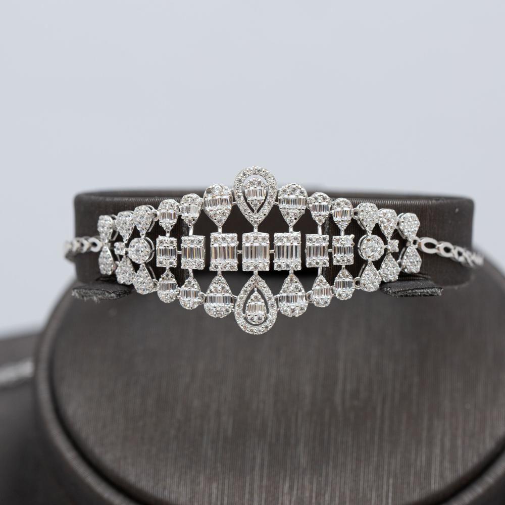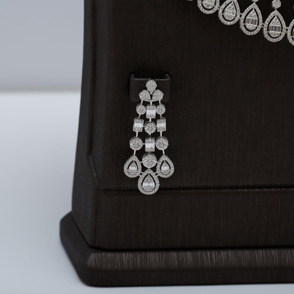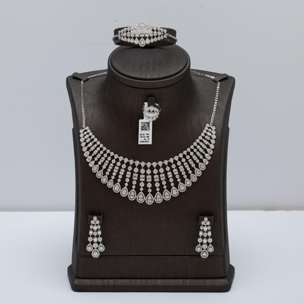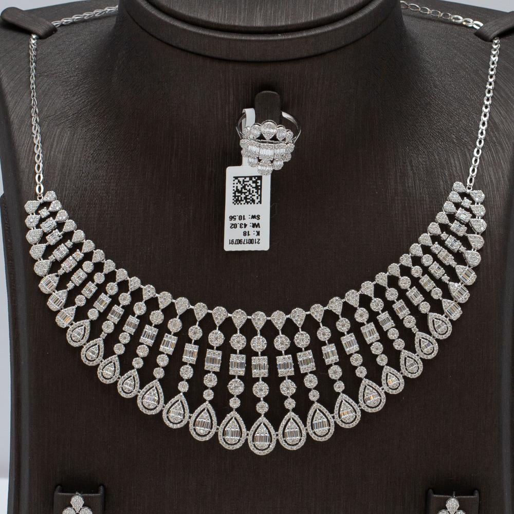 تألقي في ليلة زفافك وخطبتك بإطلالة ملكية وساحرة، مع طقم ذهب للعروس مصنوع من الذهب الأبيض عيار 18 قيراط بتصميم شبكة.