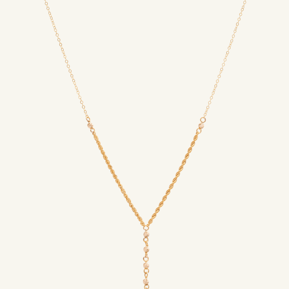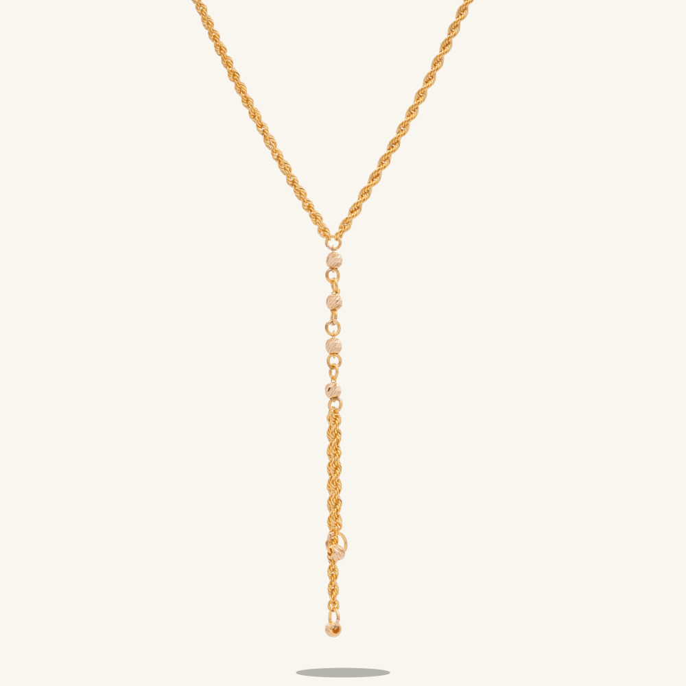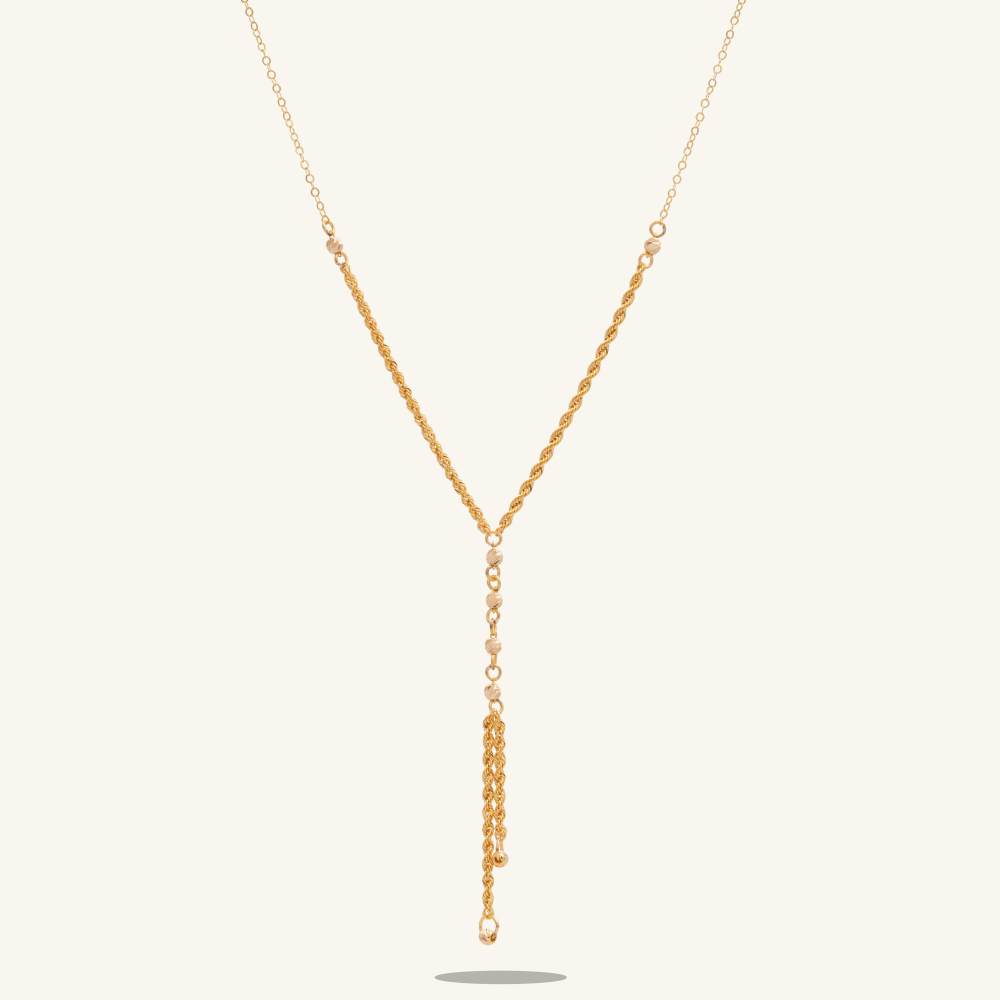 يتكون من سلسلة ناعمة ومبرومة و تعليقة سلسلتين موديل مبروم تصل بينهما حلقات وحبيبات ذهبية ناعمة بطريقة انسيابية رائعة.