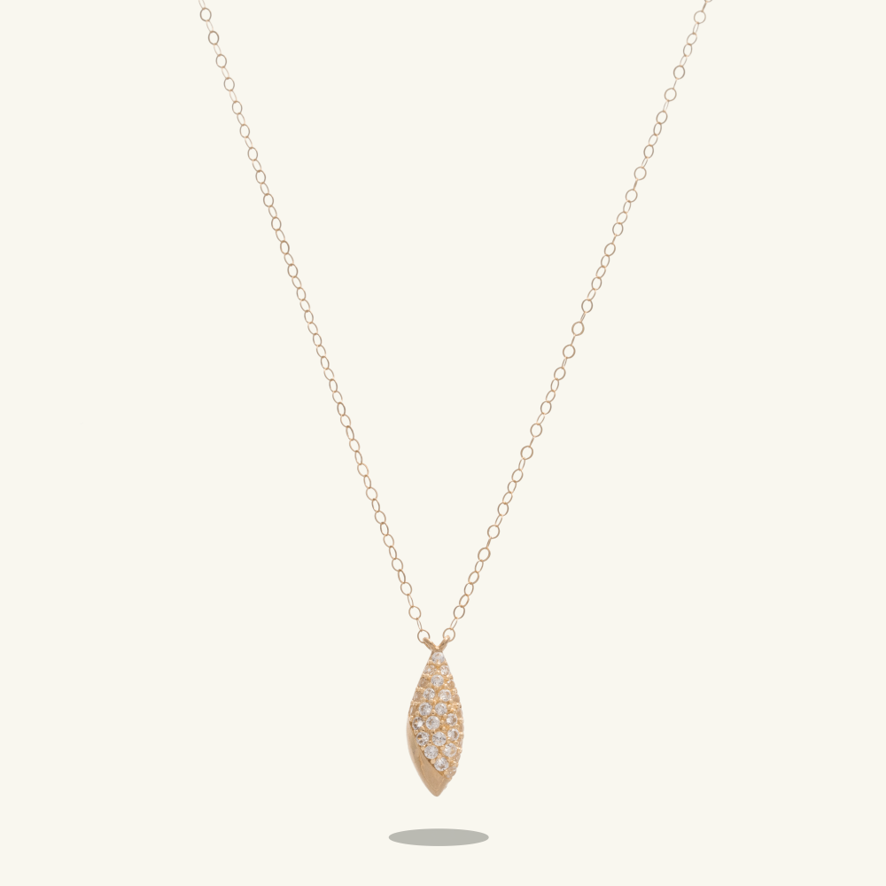 هو عقد ذهب ناعم وفاخر، مصاغ من ذهب عيار 18 قيراط بتصميم أنيق، يتكون من سلسلة ذهبية ناعمة جداً مزيناً بتعليقة موديل دمعة مرصعةً بأحجار من الزركون اللامع بتصميم ألماس.
