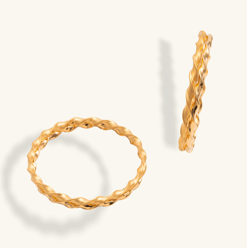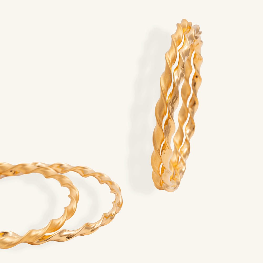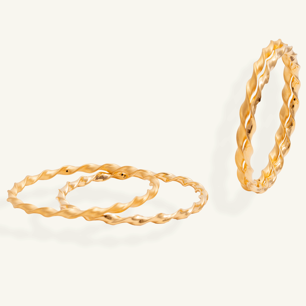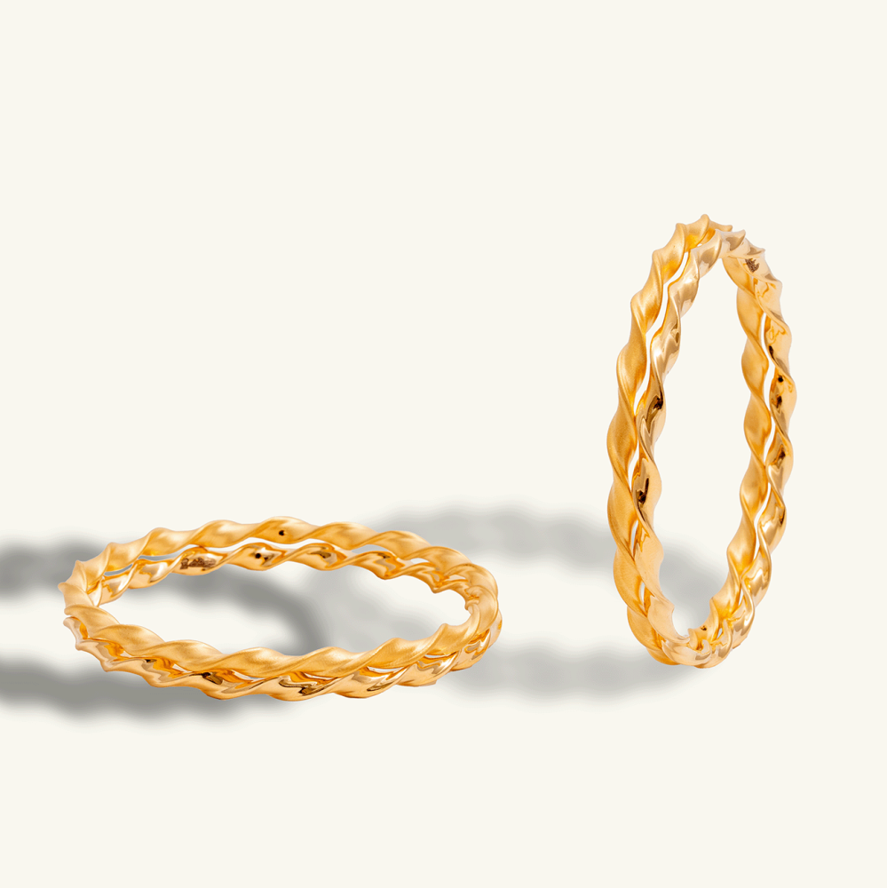 كوني أنيقة ضمن الحضور بارتداء غوايش ذهب موديل مبروم عيار 21 قيراط ذات تصميم ناعم.